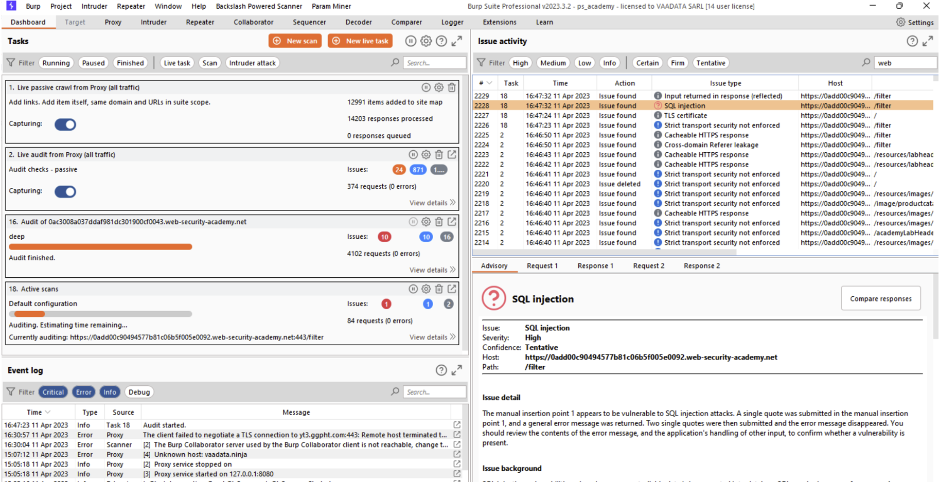 Le résultat du scan sera ensuite visible dans l’onglet « Dashboard » de Burp Suite :