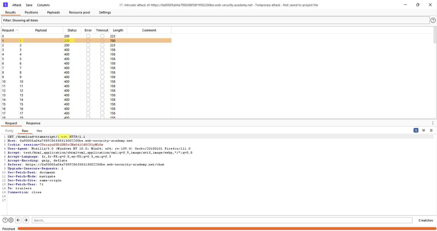 Ensuite il suffira d’appuyer sur le bouton « Start attack » pour lancer l’Intruder avec notre configuration. Une fenêtre apparaîtra et nous exposera les résultats des différentes requêtes :