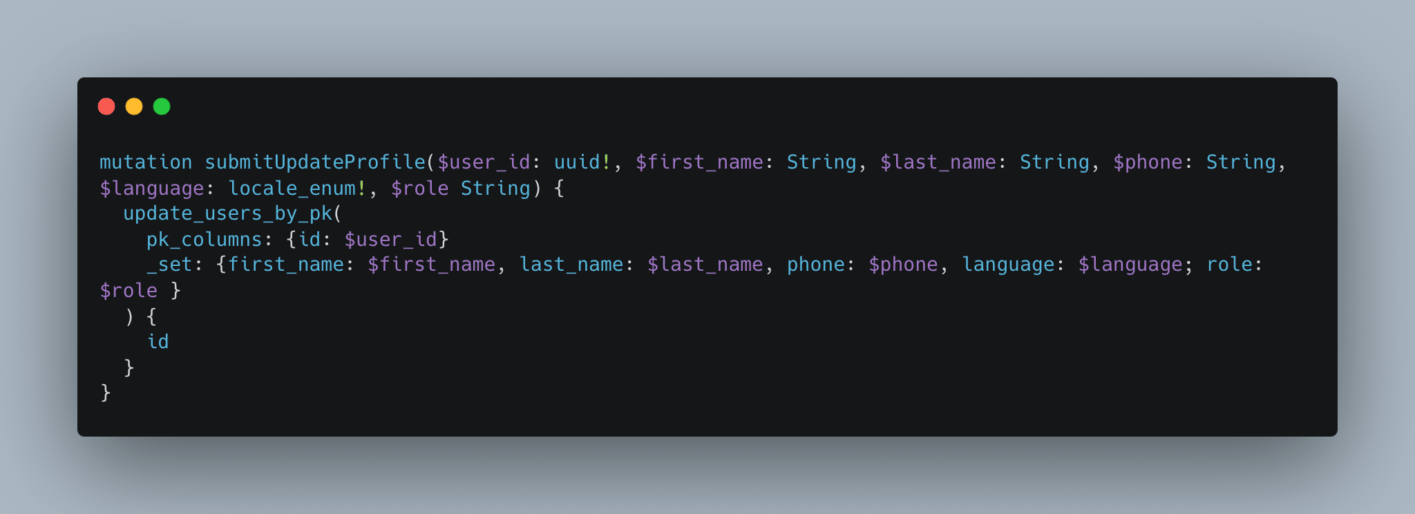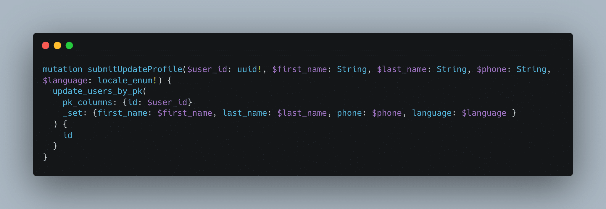 À première vue, rien de particulièrement intéressant sur cette mutation. Elle permet à un utilisateur de changer son nom, son prénom et son numéro de téléphone.