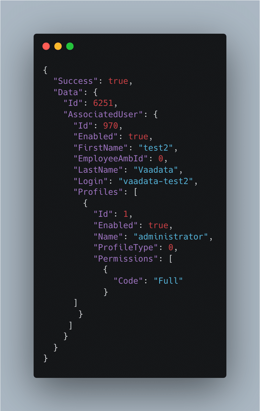 Comme nous pouvons le voir, un champ « Profiles » est retourné dans l’objet JSON correspondant au nouvel utilisateur que nous venons de créer. Il semble correspondre aux droits de l’utilisateur. Ce champ a automatiquement été ajouté. Nous pouvons notamment voir que l’utilisateur nouvellement créé a un profil de type « customer » associé à l’identifiant 5. Ce profil possède certains rôles.